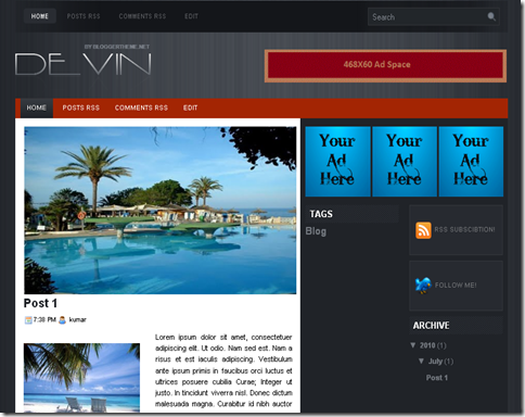 | Description | : | 3 columns layout, right sidebar, header banner (468 x 60 ) sidebar banners ( 125 x 125 ), RSS, twitter widgets, gravatar on comments, read more post, page navigation. |
