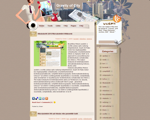| Descriptions | : | Gravity of City Blogger Template is a free blogger template with 2 columns and sidebar on the right. You can enjoy the live performances and outdoors in Travis Park in San Antonio. A famous park from the medieval period, famous for their events which include some live concerts. Different types of music talents can also be found here. |