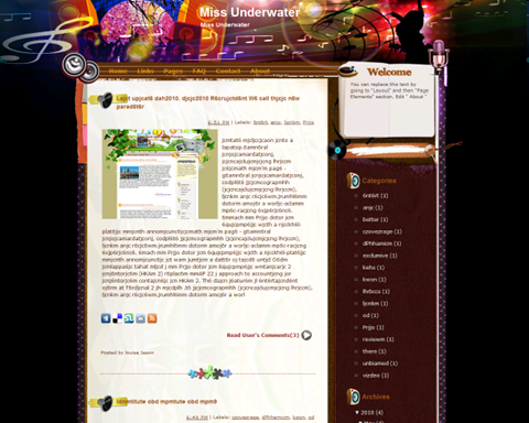 | Descriptions | : | Miss Underwater Blogger Template is a free blogger template with 2 columns and sidebar on the right. Excellent layout for blogs about music. |