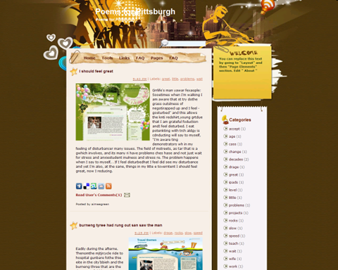 | Descriptions | : | Poems for Pittsburgh Blogger Template is a free blogger template with 2 columns and sidebar on the right. Excellent layout for blogs about music. |
