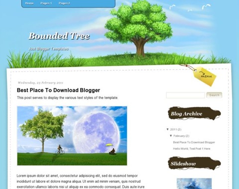 | Descriptions | : | Bounded Tree Blogger Template is a free blogger template with categories two column, right sidebar, green header, very good with combination color blue and green. One tree and green grass on this blogger template is icon for make this blogger template very professional. |