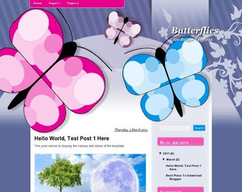 | Descriptions | : | Butterflies Blogger Template is a free blogger template with 2 columns and sidebar on the right. Template type : personal, girly, white, blue, right sidebar and rounded corners on footer. |