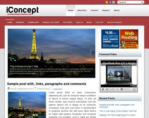 | Descriptions | : | iConcept Blogger Template is a free blogger template with 2 columns and sidebar on the right. Excellent layout with Featured Section, Fixed width, Magazine, Red, Right Sidebar, Slider, Top Navigation Bar, Web 2.0, White and more.. |