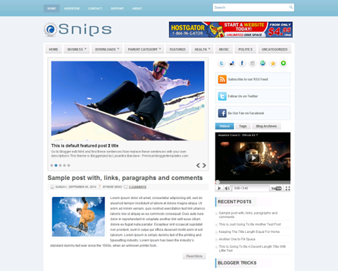 | Descriptions | : | Snips Blogger Template is free blogger template with 2 columns and sidebar on the right. Excellent layout with bookmark widget, ad banner on header, slidshow and auto readmore |