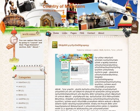 | Descriptions | : | Country of Mountains Blogger Template is a free blogger template with 2 columns and sidebar on the left. Excellent layout for blogs about travel or holiday. Template type : clean, elegant, travel template, 2 columns, left sidebar. |
