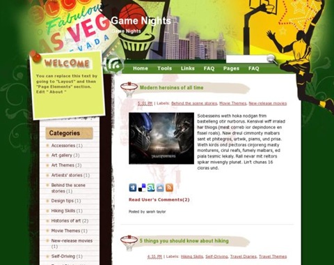 | Descriptions | : | Game Nights Blogger Template is a free blogger template with 2 columns and sidebar on the left. Excellent layout for blogs about sports. |