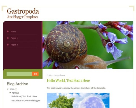 | Descriptions | : | Gastropoda Blogger Template is a free blogger template with two columns, very simple and minimalist blogger template with left sidebar, vertical menu, fixed width, 3 column widget as for footer, snail background for header design and very fast on browser. |