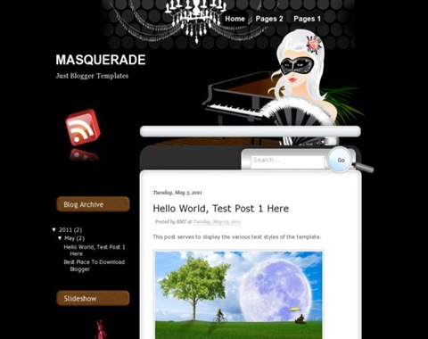 | Descriptions | : | Masquerade Blogger Template is a free blogger template with categories woman and very good for blog related about hair style, woman personal blog, beauty, salon and more. Left sidebar, fixed width, compatible on all browser, feed icon on top right header, black background is some feature on this template. |