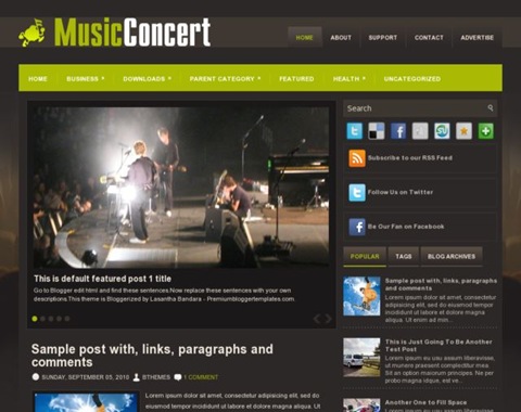 | Descriptions | : | MusicConcert Blogger Template is free blogger template with 2 columns and sidebar on the right. Template type : 1 Sidebars, 2 Columns, 3 Footer Columns, Featured Section, Fixed width, Magazine, Right Sidebar, Slider Menu, Top Navigation Bar, Black, soft and cool template. |