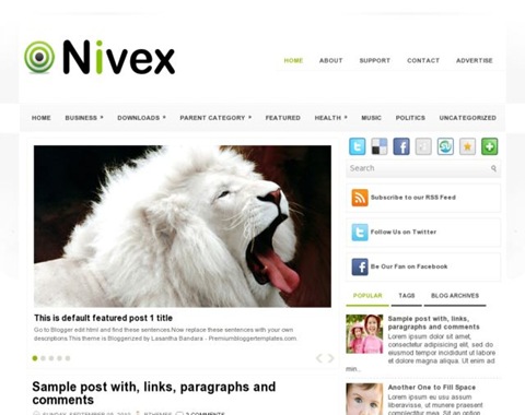 | Descriptions | : | Nivex Blogger Template is free blogger template with 2 columns and sidebar on the right. Template type : 1 Sidebars, 2 Columns, Featured Section, Fixed width, Magazine, Right Sidebar, Slider Menu, Top Navigation Bar, White |